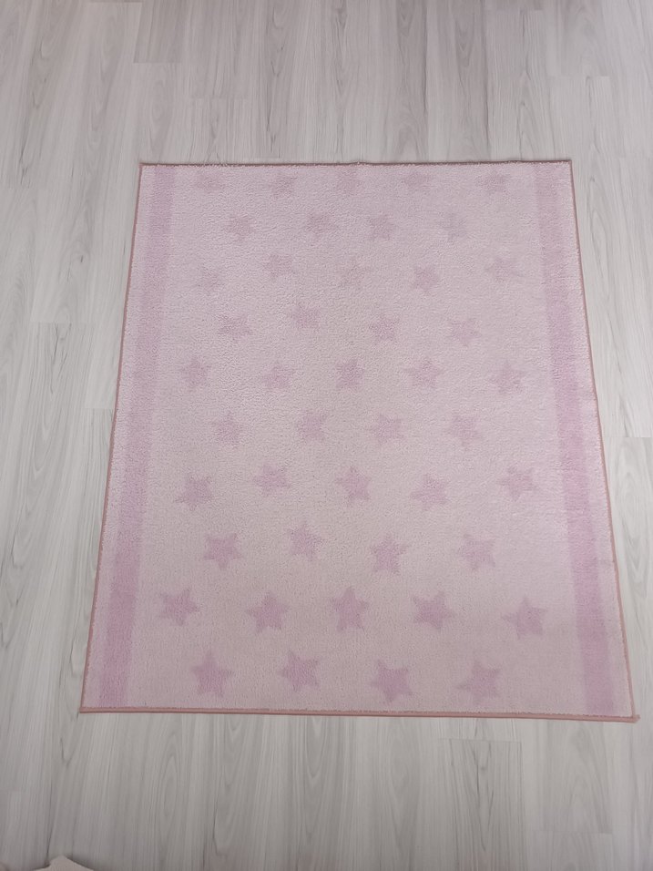 Pastel pembe renkte, yıldız desenli modern halı, mekâna yumuşak ve şık bir dokunuş katıyor.