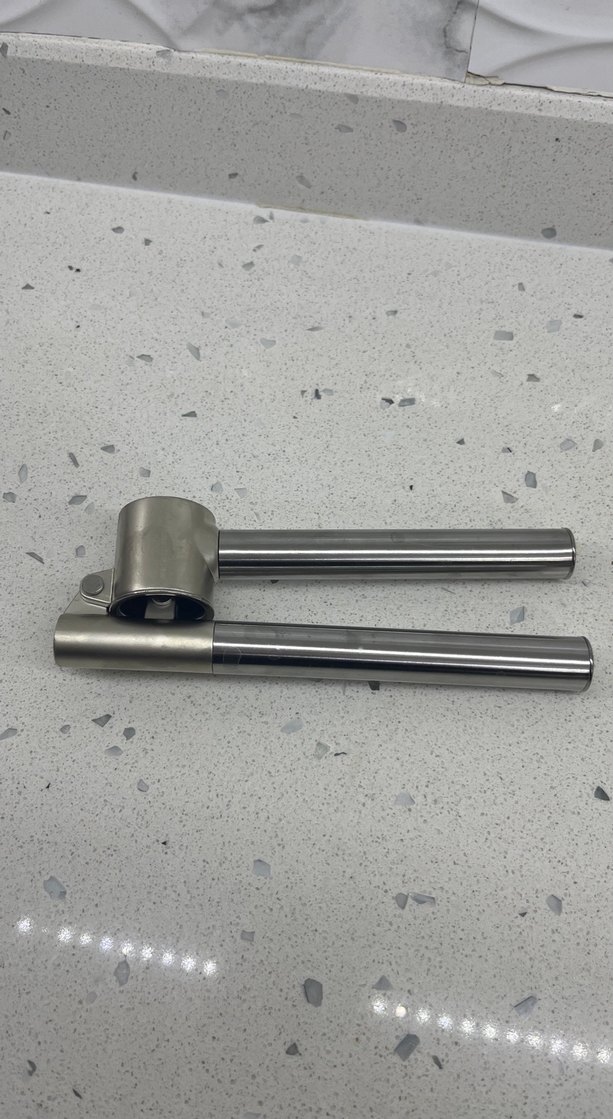 Gri metalden yapılmış bu sarımsak ezici, sağlam saplara ve kompakt tasarıma sahiptir. Sarımsakları kolayca ezmek için uygundur.