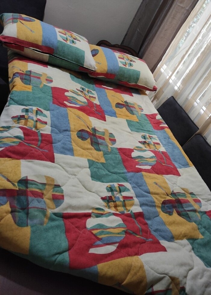 Yatak üzeri koruyucu yada yatak örtüsü olarak kullanılıyor iki yastığı vardır miflon ortudur üzerinin dikişleri ip atlaması vardır.yastiklar 37/ 57 cm ölçülerinde örtü 1.24 cm 116x2 2.32 cm boydur. Minik köşe olan yere yakın markası idaş defo vardır resimledim minik minimalist sorun değildir.