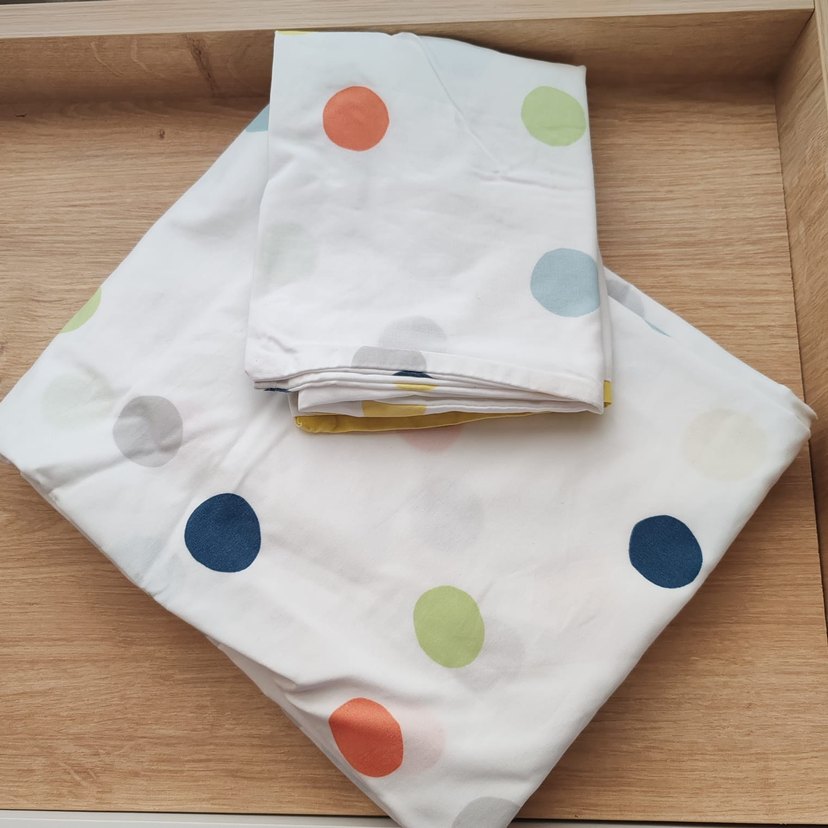 IKEA Yurtdışı pastel tonlarda çok renkli puantiyeli desenli, yumuşak kumaştan bebek nevresim takımı. Ölçüleri diğer markalarınkilerden farklıdır. Mavi çarşaf takıma ait değildir ama onu da göndereceğim.