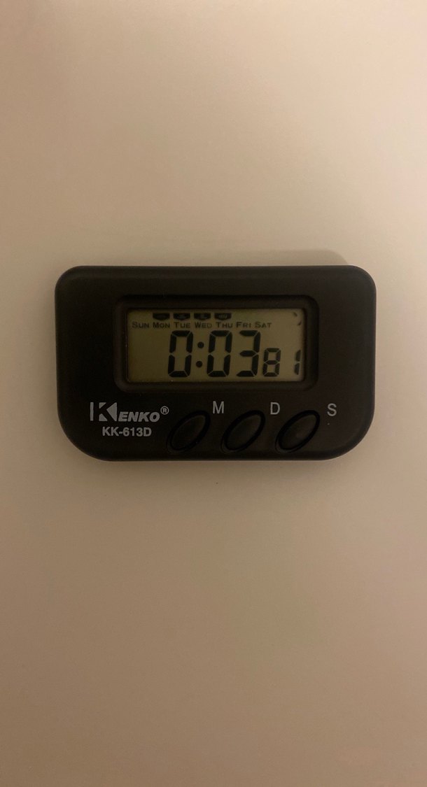 IKENKO KK-613D dijital masa saati koyu renkte kasa ve beyaz ekran içerir. Zaman, hafta günü gösterir ve dakika, gün, saniye ayar düğmeleri bulunur. ⏰