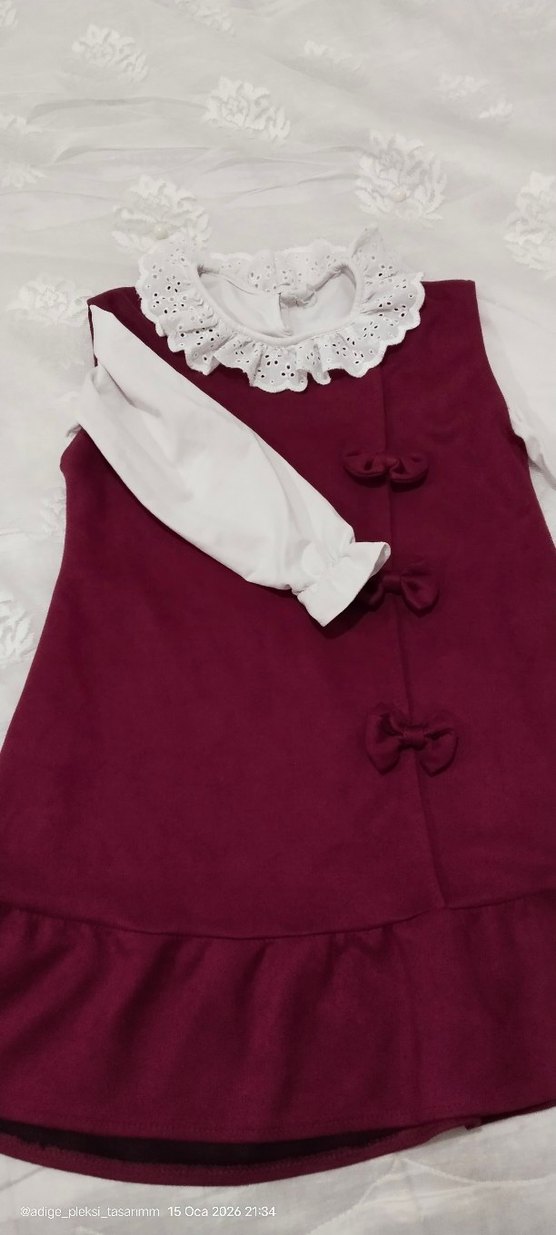 Bordo renkli, nakış detaylı ve düğmeli kız çocuk elbisesi. Yaka detaylı, kolsuz, yumuşak ve sıcak kumaştan, klasik şıklık sunar.