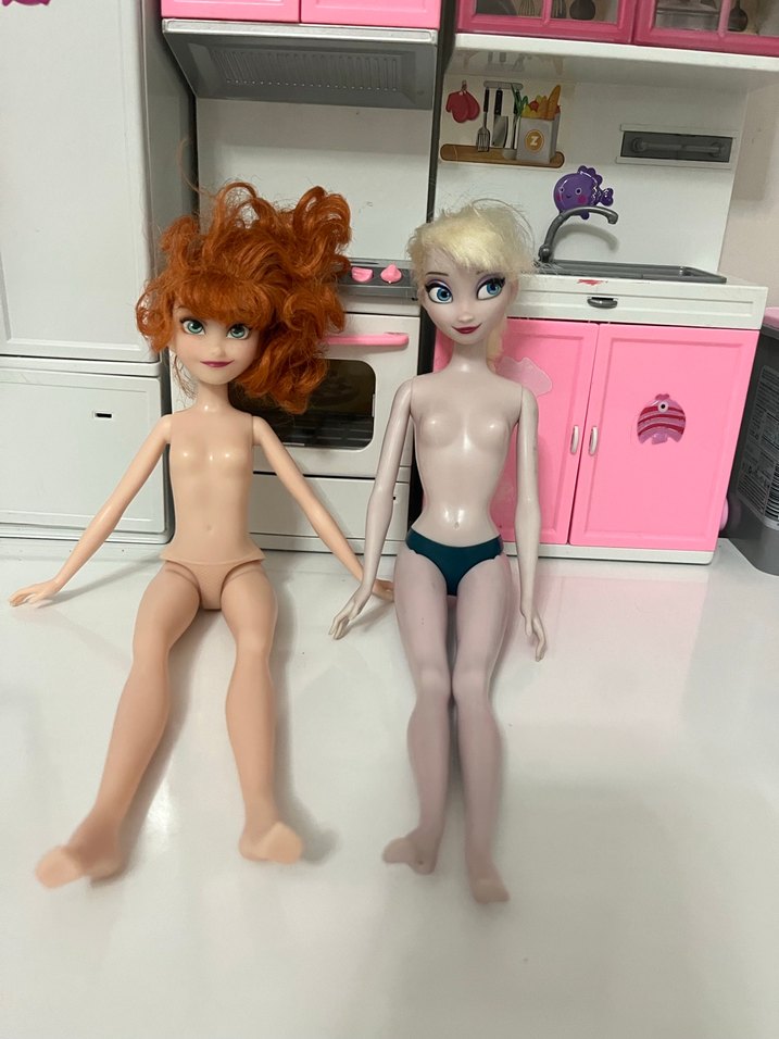 Kıvırcık kızıl saçlı ve sarışın iki pastel renkli bebek, minimal giysilerle beyaz yüzeyde oturuyor. Arka planda pembe beyaz oyuncak mutfak var.