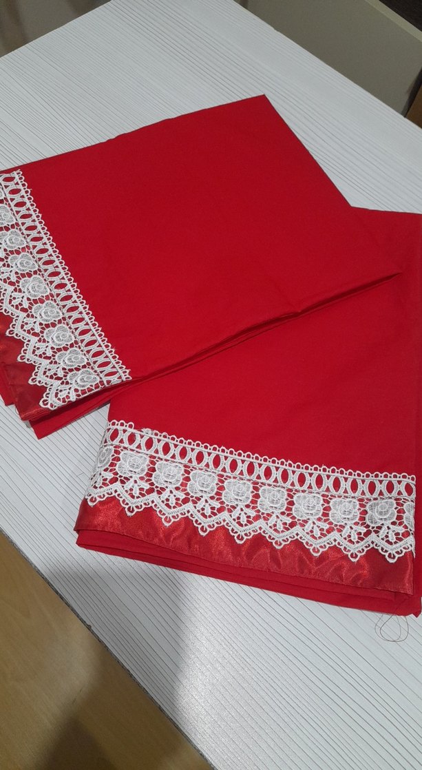 Canlı kırmızı renkte, kenarlarında beyaz nakışlı dantel detayları bulunan kapaklı yastık kılıfı özel dikim
