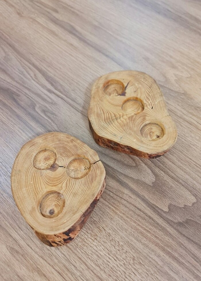 İki adet doğal ürün ahşap kütük mumluk. Fotoğraflar güncel olup, durumu görüldüğü gibidir.