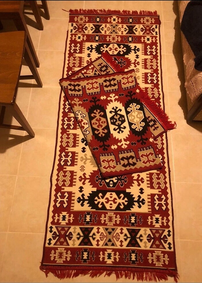 İki adet kök boya geometrik desenli kilim