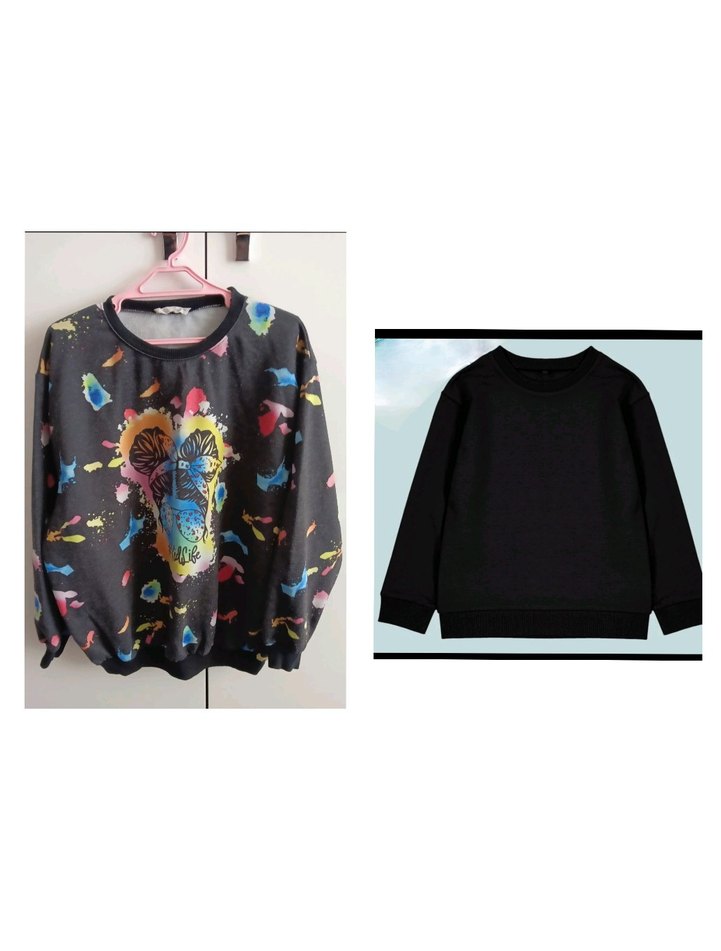 İki adet yuvarlak yaka ve uzun kollu siyah baskılı sweatshirt, renkli desenlerle günlük kullanıma uygun.(marka temsili)
