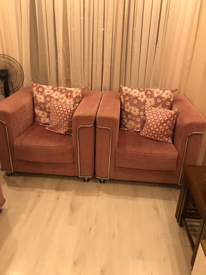Rahat kullanışlı iki adat tekli koltuk, yastıklarla beraber. Bir tanesinde beşinci resimde göründüğü gibi bir renk açıklığı var. Yüksekliği 74cm, uzunluğu 89cm, genişliği 96cm dir.