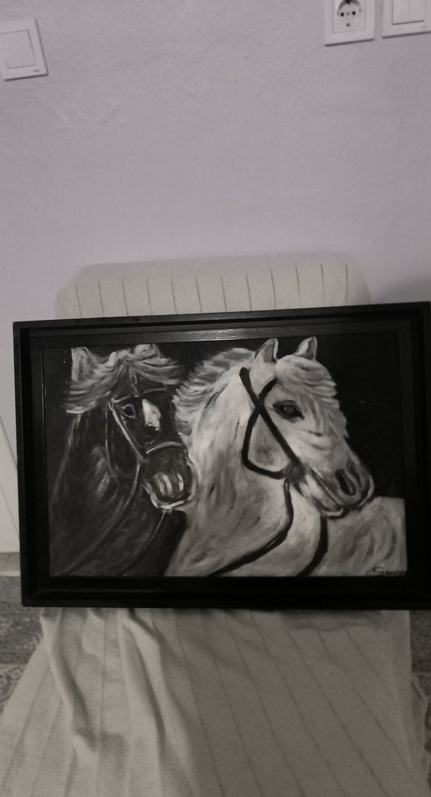 kargo için mesaj atin atın hareketini yansıtan, koyu gri tonlarda, siyah çerçeveli tablo. kahve rengi adın olduğu bölgede biraz içine gömülme var geriesi lazım başka kusur yok elimi işaret ettiğim yerde