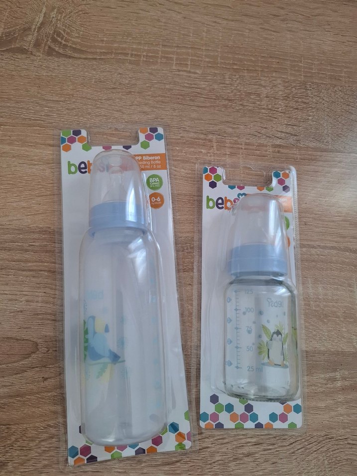 0-6 ay bebekler için ölçü işaretli, hayvan desenli iki mavi pastel bebek maması biberonu. BPA içermez. büyük plastik küçük cam