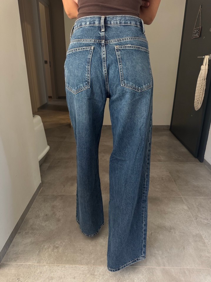 Gevşek kesim, iki çapraz düğmeli kadın kot pantolon, normal boy, günlük sokak stili için uygun, mavi renktedir. Bir kez giydim.