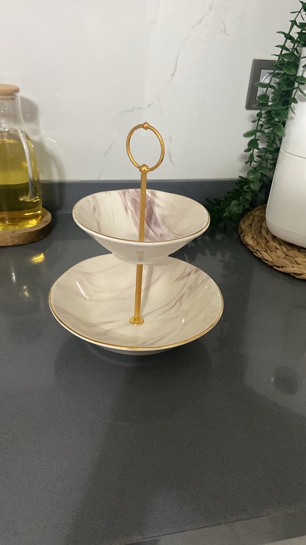 Beyaz ve gri mermer desenli, altın renkli saplı iki katlı servis tabağı. ️