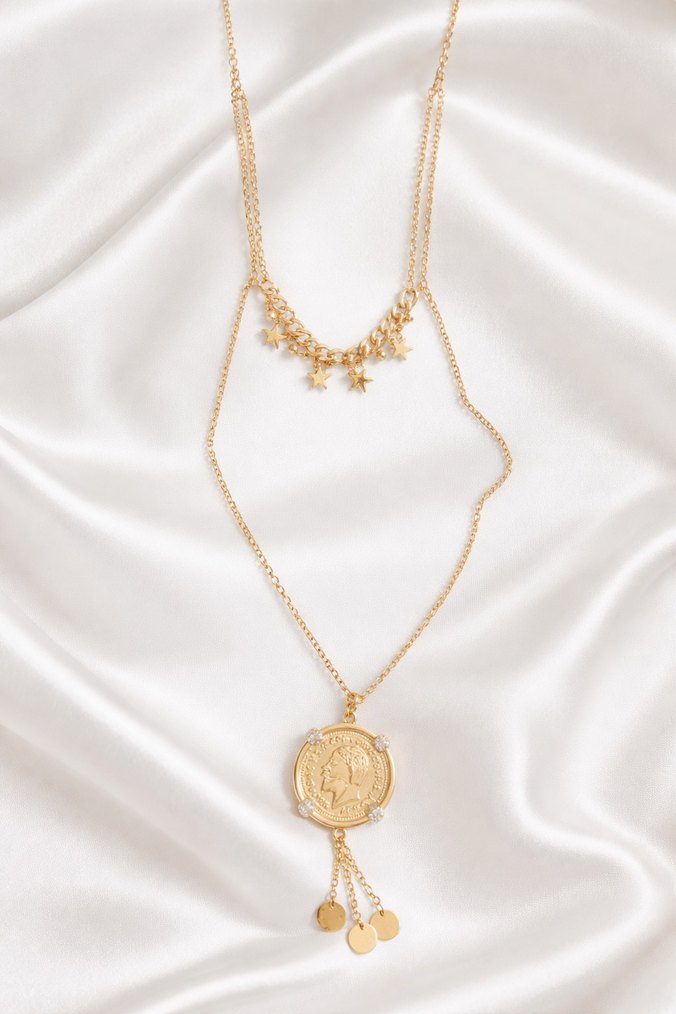 İki katlı uzun gold zincir kolye, yıldız detaylı ve sarkaçlı madeni para figürüyle günlük kullanıma uygun bohem tarzda.
