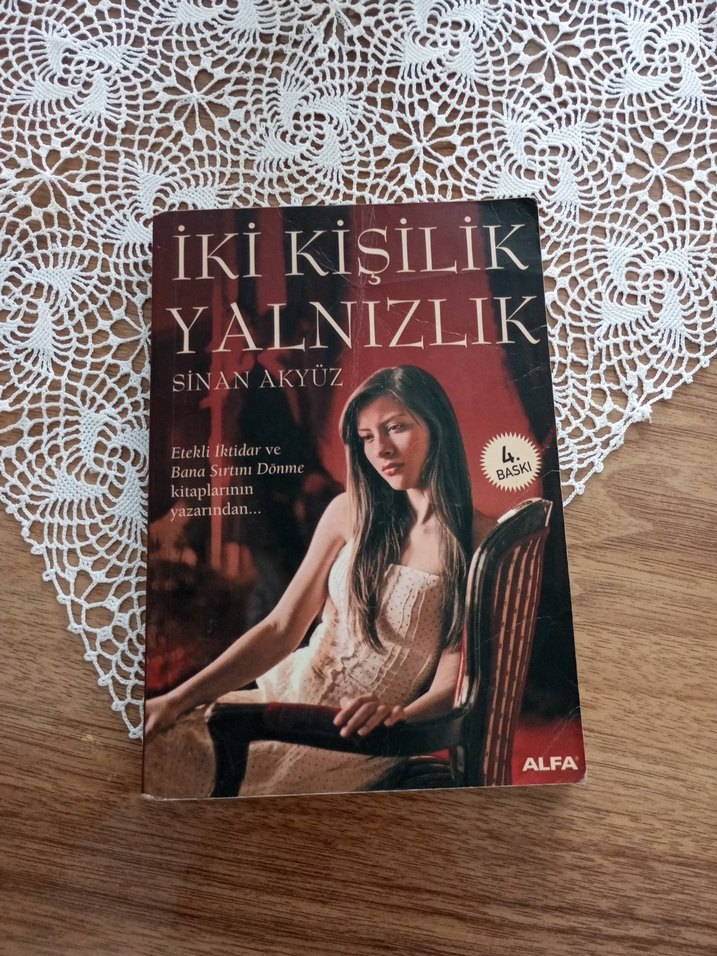 Sinan Akyüz'ün "İki Kişilik Yalnızlık" adlı romanı, 4. baskı olarak Alfa yayınevinden çıkmıştır. Kapakta sandalyede oturan bir kadın yer alır.