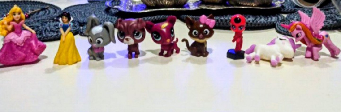 iki Miniş iki unicorn iki Barbie hayvanı üç Disney karakterleri kahverengi köpeyin Küçük hasarları var pembeli prensesin kafası oynuyor Koyu mor renkte, sevimli gözlere sahip üç küçük hayvan figüründen oluşan aksiyon figürleri seti.