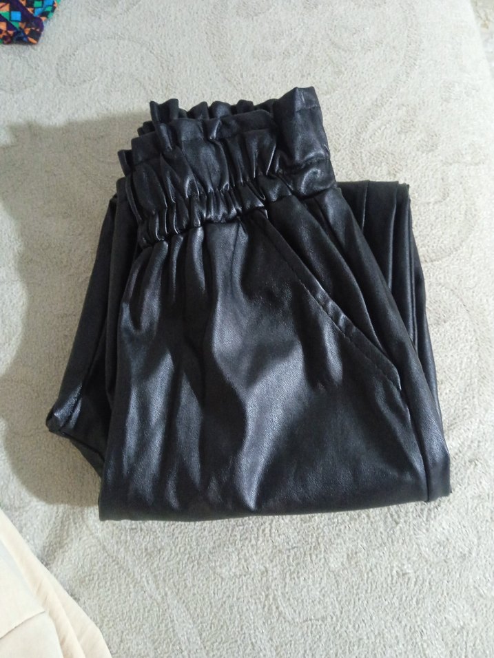 Siyah deri, fırfırlı ve bol kesim midi pantolon. Gotik ve avangart tarzı yansıtır, günlük kullanım için uygundur. (11___13 yaş )