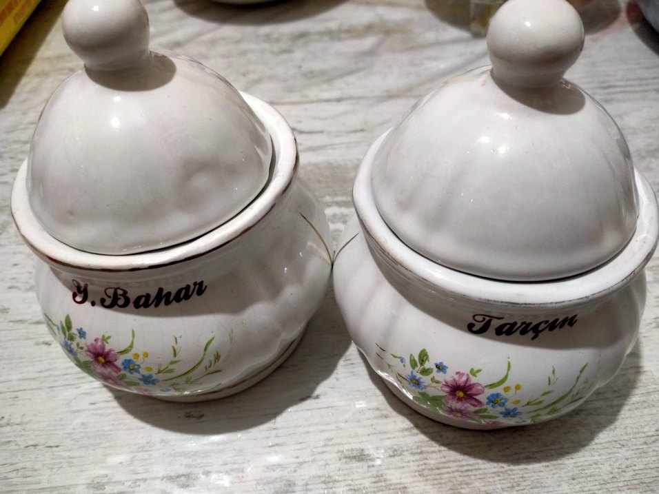 Pastel beyaz porselen baharatlık zarif çiçek desenleri ve pürüzsüz yüzeyi ile uygundur.