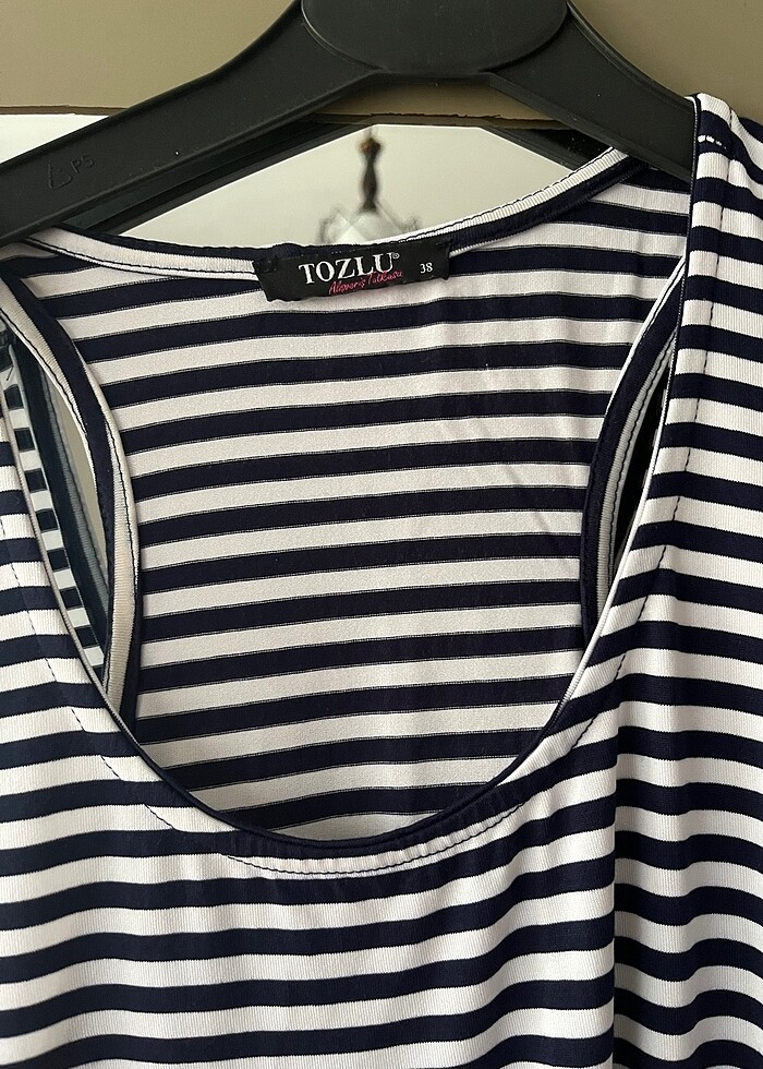 İki parca likralı çizgili penye elbise üstünde krop tişört vardır 38 beden yırtmaçlı tek tarafta