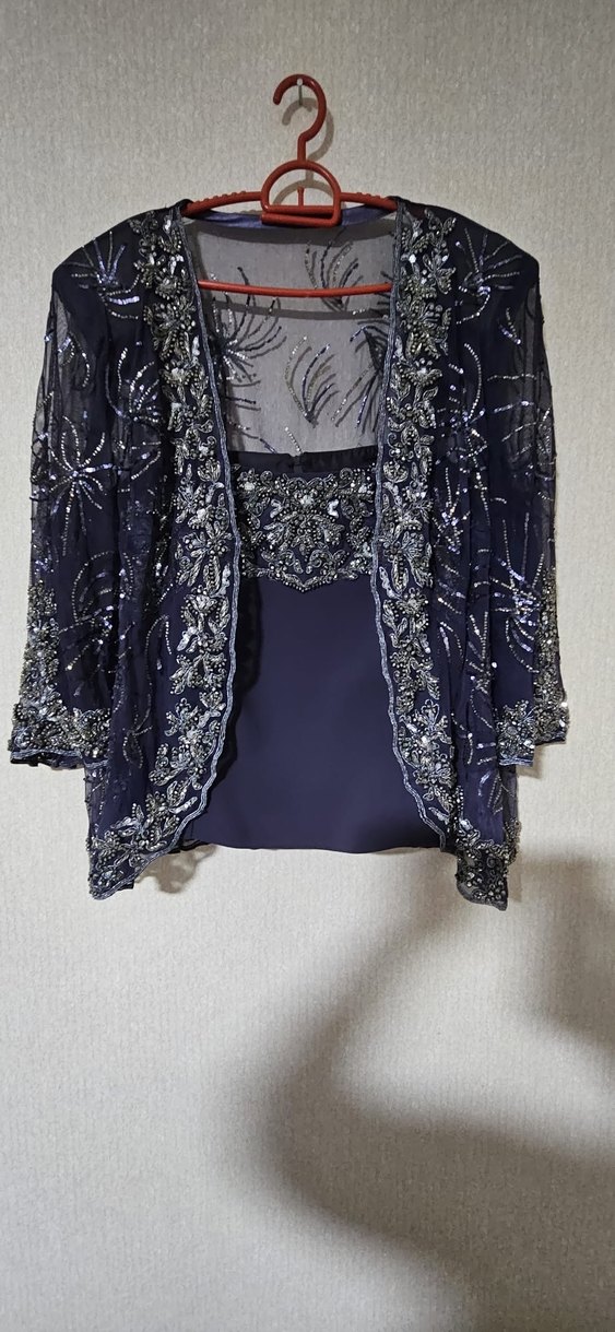 Uzun lacivert abiye elbise, straplez yaka ve bol kesimle nakışlıdır. İnce işleme detaylı şeffaf ceketle vintage şıklık sunar. Defosuz ve temiz ürün.