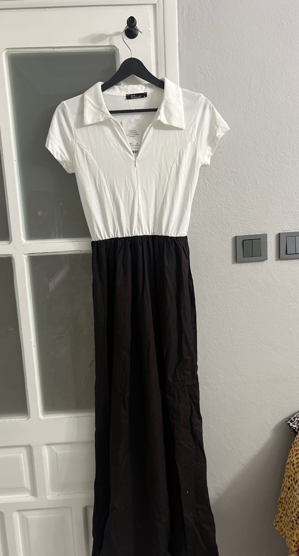 , yakalı ve kısa kollu, bel kısmı olan koyu kahverengi beyaz uzun elbise. Rahat ve şık günlük sokak stili için uygundur. Hiç giyilmedi şade süresi geçtiği için elimde de kaldı aldığım fiyata yazdım