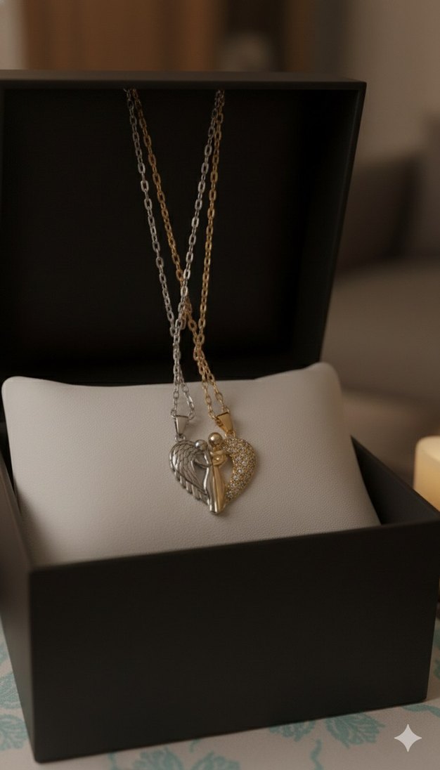 Altın ve gümüş tonlarında, zincir detaylı melek kanadı ve kalp figürlü kadın kolye, romantik akşamlar için uygun.