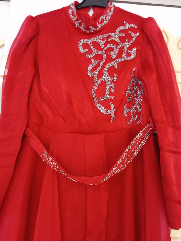 Yüksek yakalı, uzun kollu, kırmızı, parlak nakışlı ve drapeli, klasik şıklıkta uzun abiye elbise.