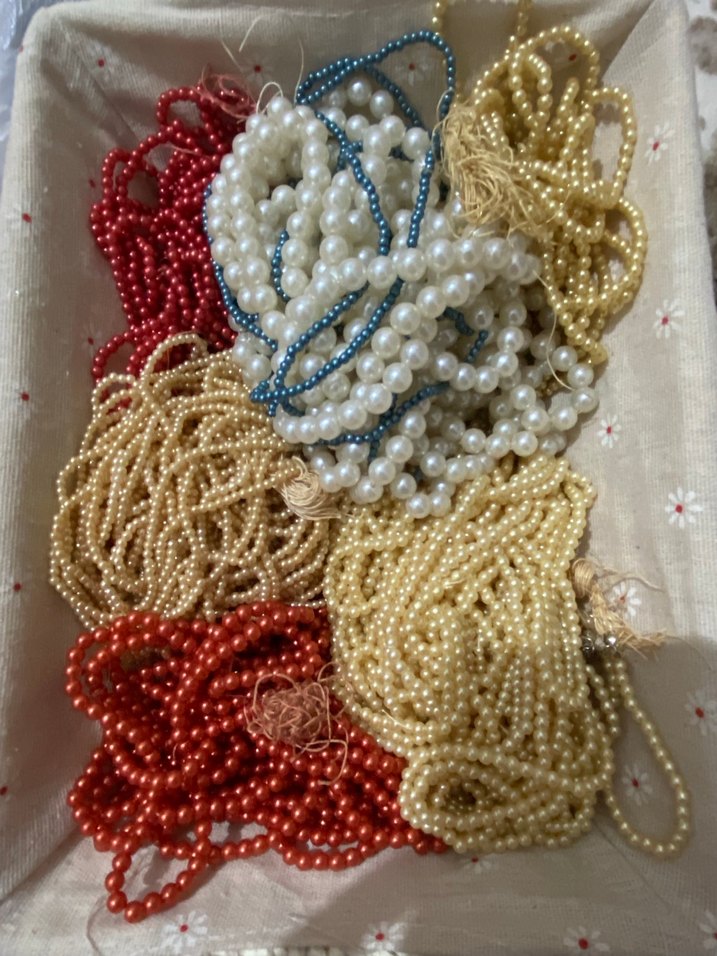 Kırmızı, beyaz, mavi ve altın tonlarında çok renkli inci boncuk seti. Tırnak süslemeleri ve el işleri için uygundur.
