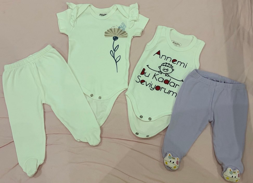 İlk takım 3-6 ay ikincisi 0-3 ay İlk takım panço ve sıfır gibi bir kez giyildi herhalde ikinci takım pantolonu çıngıraklı ayaklı