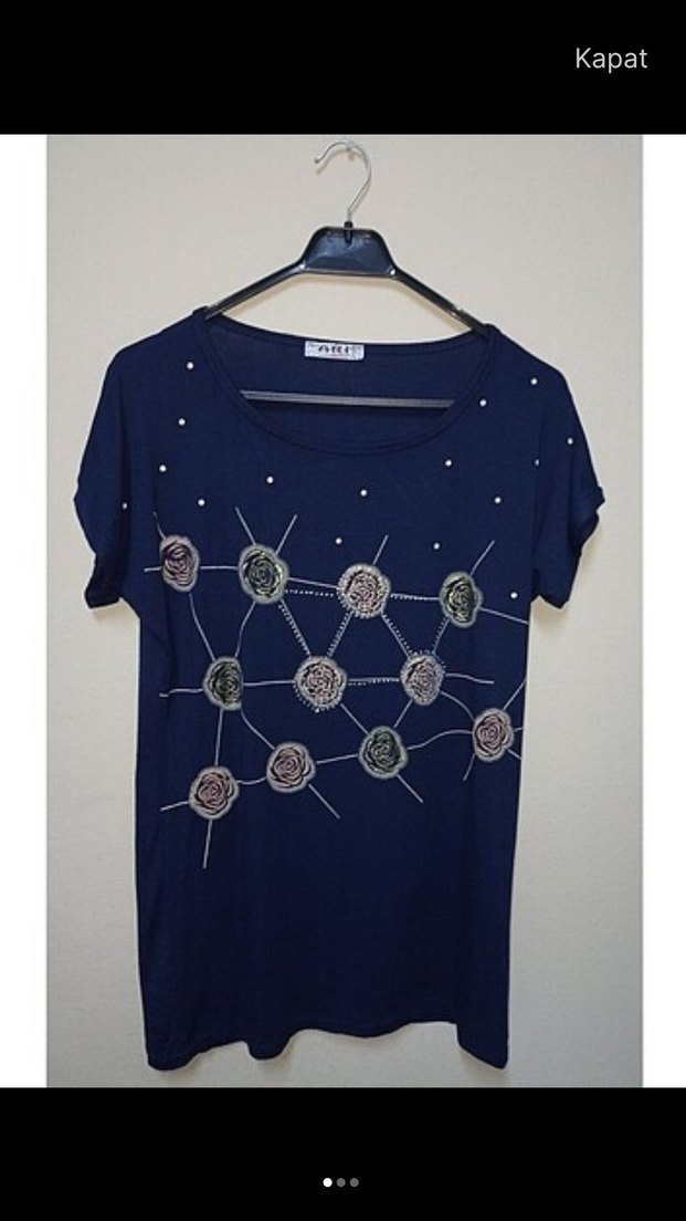 Kısa kollu, yuvarlak yakalı, lacivert ve turuncu tişört. Tekstil kumaş üzerinde payet işlemeli çiçek desenleri bulunur, rahat ve salaş kesimdir.