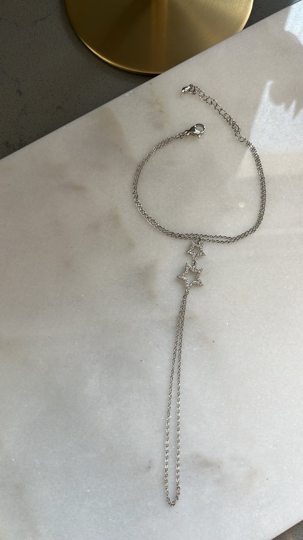 Minimalist tasarımlı el zinciri, iki yıldız figürlü zincir detaylarına sahiptir. Bohem ve retro stile uygundur, günlük kullanıma idealdir. Zincir gümüş renkli, altın detaylıdır. ✨