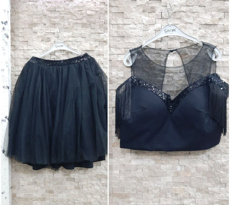 kabarık tül etek astarlı üst kısmi kollar pul ve saçakli roba kısmı tüldür
