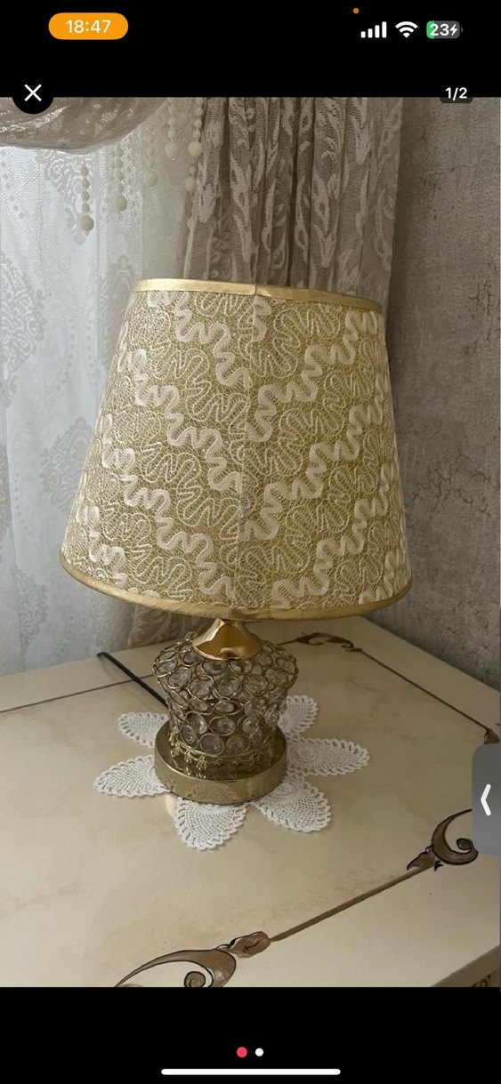 Bej renkte, dantel desenli abajur ve kristal detaylı dekoratif tabanı olan masa lambası, ortamınıza yumuşak bir ışık sağlar.