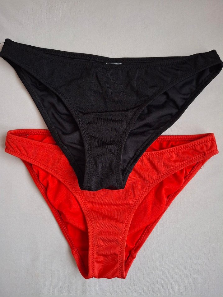 Kırmızı ve siyah renklerde, sportif ve cesur görünüme uygun, ince askılı ve şık tasarıma sahip bikini altları. Athleisure tarzı için ideal.