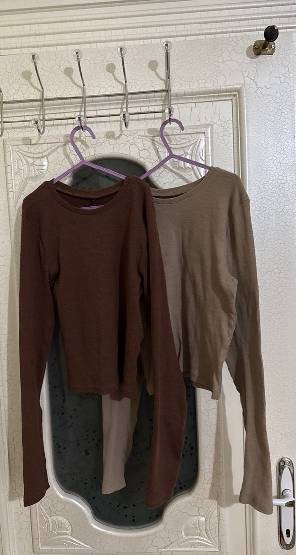 Yumuşak kumaştan yapılmış, koyu kahverengi uzun kollu iki üst askıda asılı.