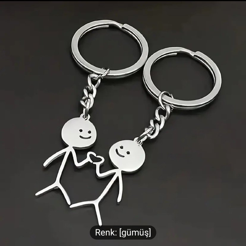 İkili Çift Anahtarlık. Parlak gümüş renkli, zincir detaylı minimalist anahtarlık. İki gülen figür, tasarımıyla rock punk havasında street wear tarzına uygun.