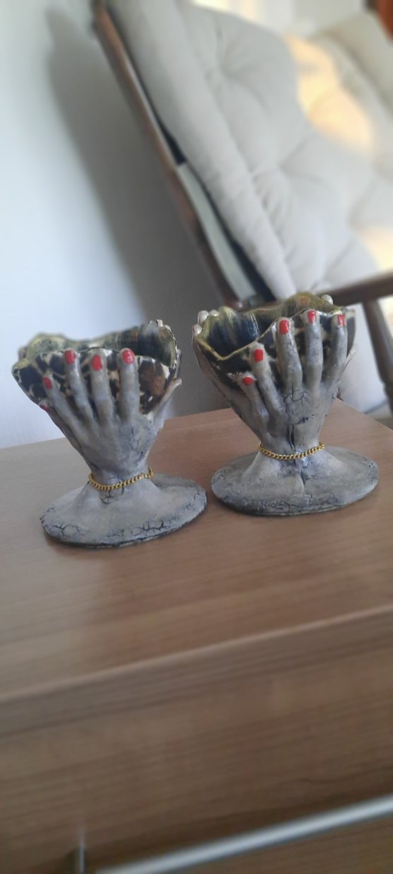 Alçıdan imal edilmiş ürünün tasarımı ve boyaması kendi el emeğimdir. Mumluk, saksı, dekoratif... olarak kullanabilirsiniz. Hediye edebilirsiniz. Ojesiyle aksesuarıyla şık görünümü sayesinde her ortama uyumlu. Verniklidir. (mumlar ve çiçekler dahil değildir.) Yükseklik 15 cm Genişlik 11 cm