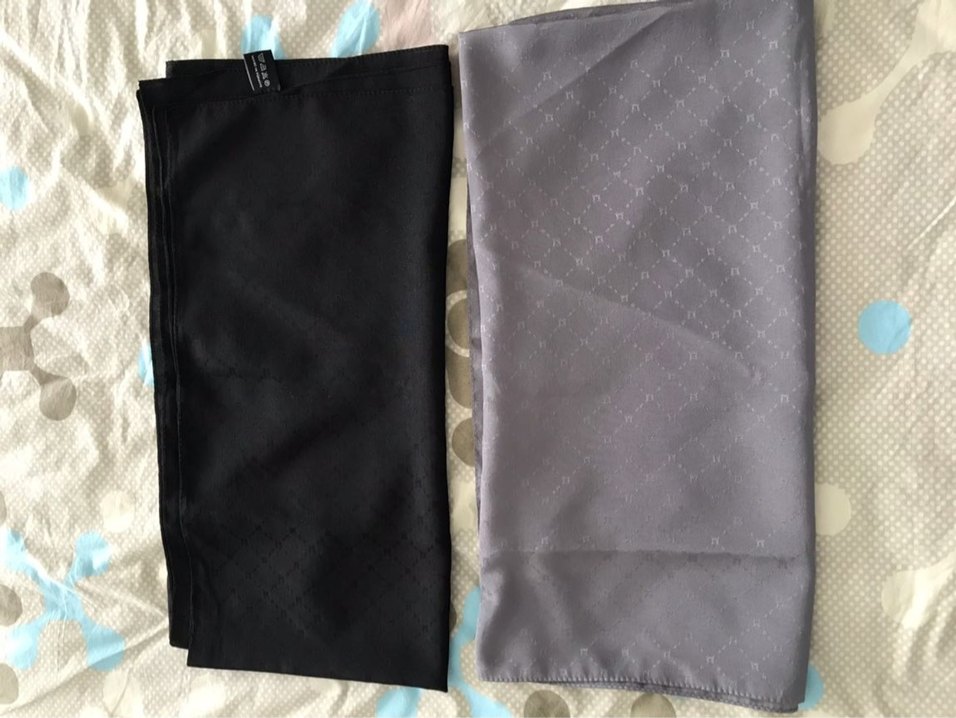 Dökümlü tarzda, yumuşak sentetik kumaştan yapılmış gri ve siyah kadın eşarplar. Minimalist ve sade giyim için uygun.Ebat 90×90