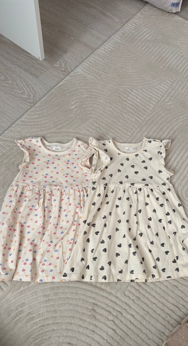 86 beden fırfır detaylı sıfır kol elbise. Biri kalplı diğeri çiçek desenli. Yurt dışından alınmıştır.