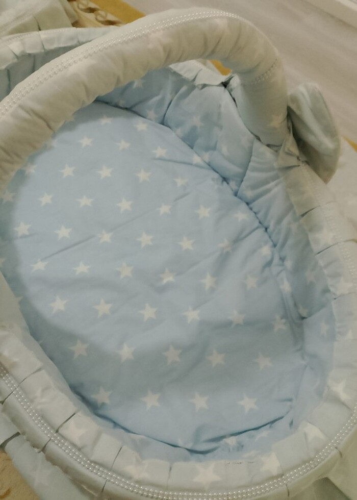 Ürün 1 adet bebek yatağıve şampuan sepetinden oluşmaktadır hasır örgü sepet ler sağlam yanlız kumaşı biraz solmuş
