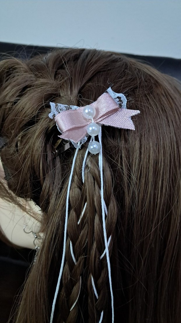 Bej renkte, fiyonk şeklinde saç tokası. Dantel ve inci detayları ile süslenmiş, ince şeritler sarkıyor, örgü süslemelerinde kullanılabilir. Çift olarak satılmaktadır.