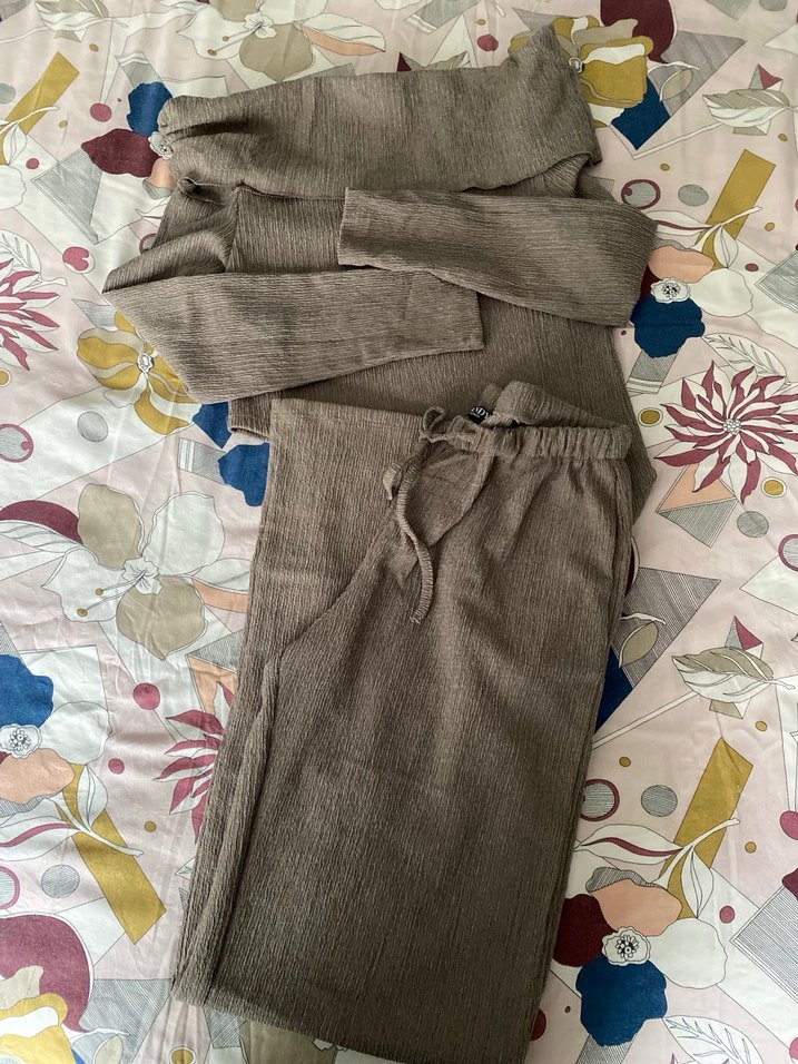 Gofre kumaş palazzo pantolon ve kayık yaka üst . Üst bluzun bel kısmı eğimli bir tarafı dekolte şeklinde geliyor alt rahat kesim çok şık duruyor üstte iki defa kullandım