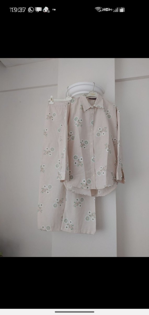 Keten ikili takım S bedendir ama m bedene de uyar.Sıfırdır kullanılmamıştır.Minimalst bir takımdır.Pantolonun beli lastiklidir.