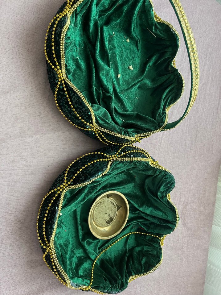 Yeşil kadife astarlı, boncuklu kenarlara sahip parlak altın renkli saklama sepetleri, küçük eşyalar için uygundur.