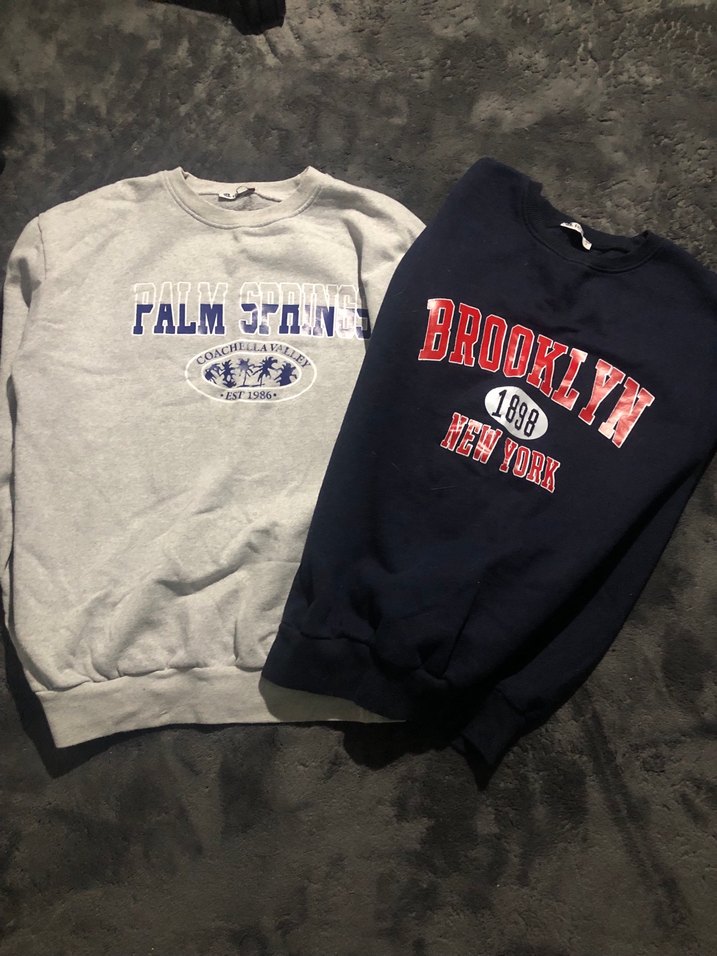 İkisi de hiç giyilmedi Pamuklu, uzun kollu, bisiklet yaka, bol kesim gri lacivert sweatshirt.