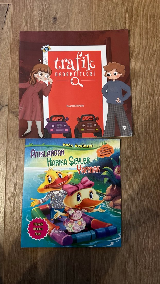 İki çocuk kitabı: biri trafik dedektiflerinin maceraları, diğeri atıklardan harika şeyler yapmayı anlatıyor.