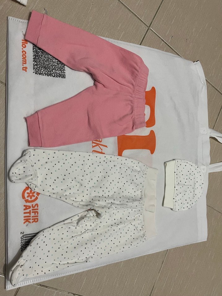 Bu bebek kız takımı, açık pembe uzun kollu üst, küçük nokta desenli beyaz pantolon ve uyumlu şapka içerir. 'AFIR' yazısı bulunur, yumuşak ve rahat bir yapıya sahiptir.