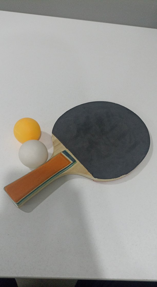 Ahşap saplı siyah masa tenisi raketi ve turuncu ile beyaz renkli iki top içeren renkli masa tenisi seti.