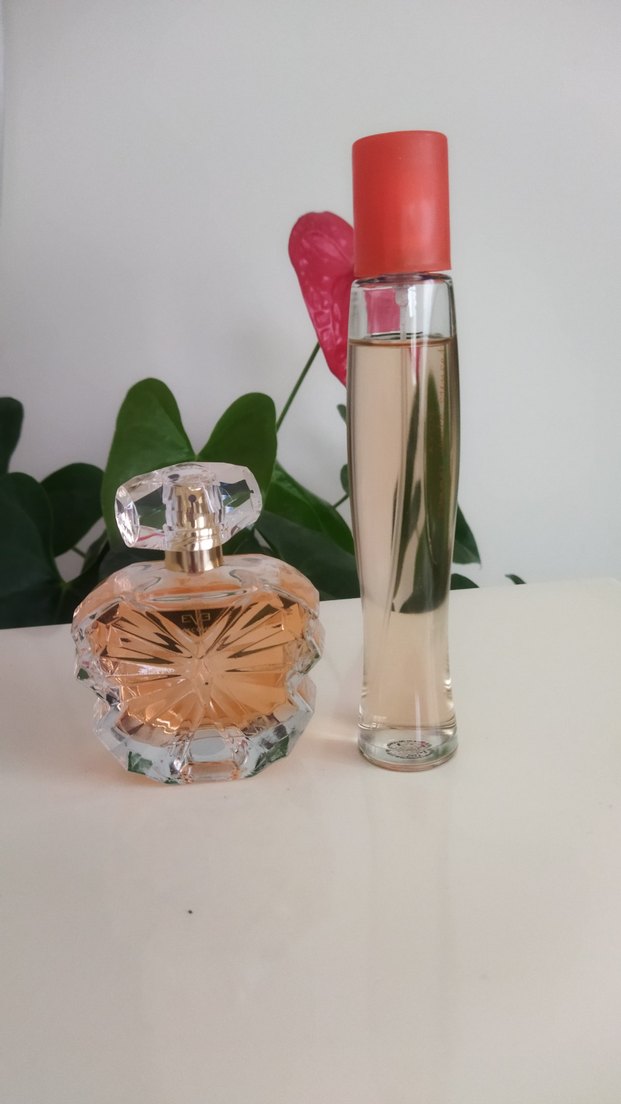 Kristal görünümlü ve uzun şişeli kırmızı kapaklı iki kadın parfümü.