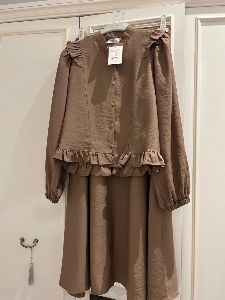 Yumuşak keten kumaştan, uzun kollu ve fırfır detaylı, ikili takım