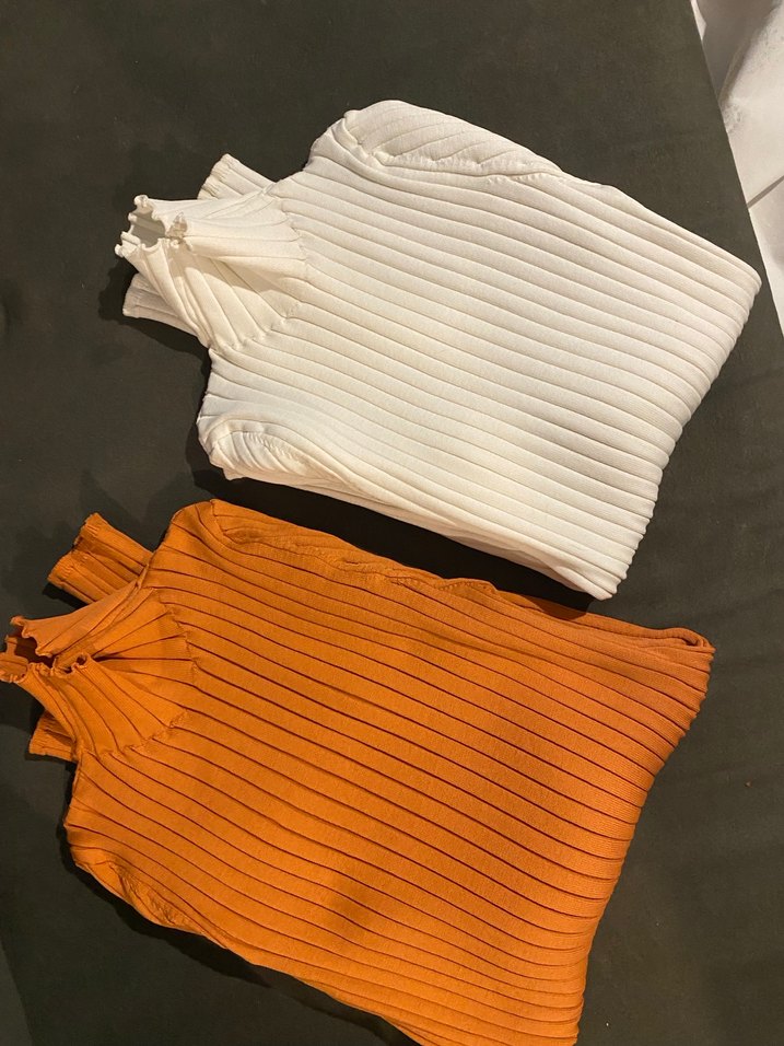 Kadınlar için tasarlanmış, yüksek yakalı ve pilili detaylara sahip, uzun kollu, vücuda oturan beyaz ve somon triko. Rahat ve sokak stiline uygun. Uygun olması için ikili satıyorum, tekli isteyen teklif verebilir, hiç kullanılmadı, iyi günlerde kullanın